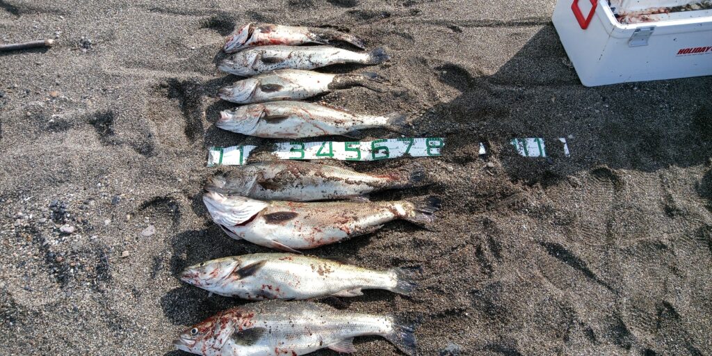 さっきより人が増えてる。釣れだしたのかな?と見てみると浜でパタパタしてる魚体が。